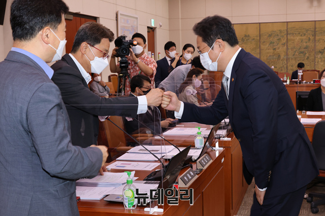 황희 문화체육관광부 장관이 17일 오전 국회에서 열린 국회 문화체육관광위원회 전체회의에 참석해 의원들과 인사를 나누고 있다. (사진=공동취재단)