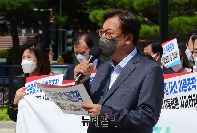 정진석 국민의힘 의원이 17일 오후 서울 종로구 청와대 분수대 앞에서 열린 국민의힘 긴급의원총회에서 모두발언을 하고 있다.