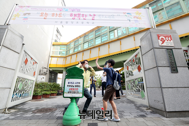 조희연 서울시 교육감이 17일 오전 서울 강서구 월정초등학교를 방문해 등교중인 학생들과 인사하고 있다.