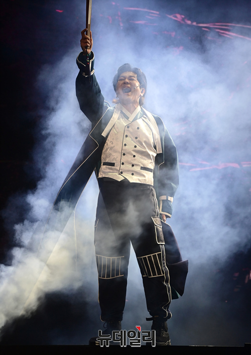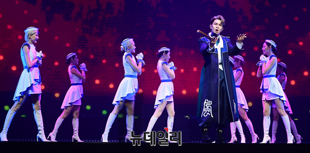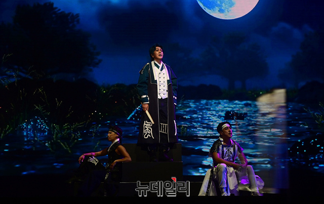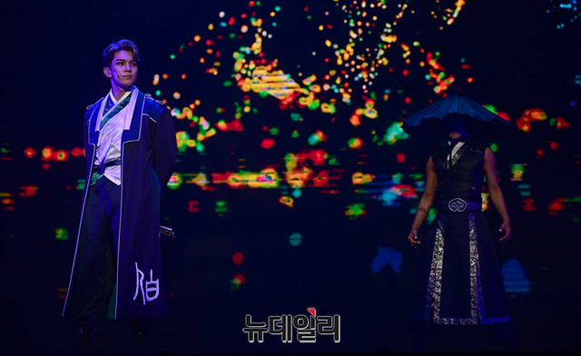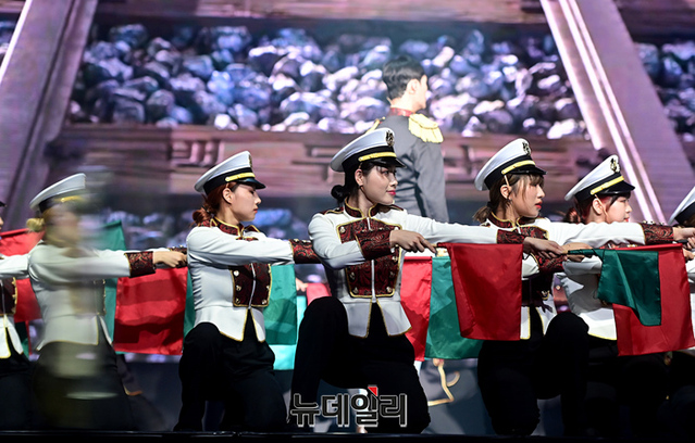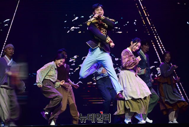 한국형 블록버스터 쇼뮤지컬 '원더티켓-수호나무가 있는 마을(총감독 최광일, 연출감독 김혜진)' 출연배우들이 17일 오후 서울 용산구 블루스퀘어에서 열린 언론시연회에서 하이라이트 장면을 선보이고 있다.'원더티켓'은 세계에서 유일한 비무장지대 '평화와 화해'의 공간으로 자리매김 되도록 한국의 대표문화관광 콘텐츠인 공연에 첨단 ICT 기술을 도입해 기획됐다.공연은 9월 17일부터 26일까지 임진각 평화누리 야외공연장에서 열린다. 티켓은 8월 18일 오후 2시부터 인터파크와 네이버티켓에서 구입 가능하다.