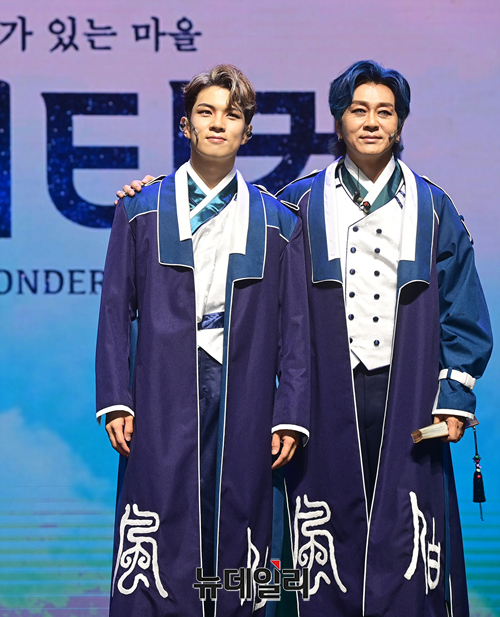 풍백 역을 맡은 윤도현, 유회승이 17일 오후 서울 용산구 블루스퀘어에서 열린 쇼뮤지컬 '원더티켓-수호나무가 있는 마을(총감독 최광일, 연출감독 김혜진)' 언론시연회에서 포토타임을 갖고 있다.'원더티켓'은 세계에서 유일한 비무장지대 '평화와 화해'의 공간으로 자리매김 되도록 한국의 대표문화관광 콘텐츠인 공연에 첨단 ICT 기술을 도입해 기획됐다.공연은 9월 17일부터 26일까지 임진각 평화누리 야외공연장에서 열린다. 티켓은 8월 18일 오후 2시부터 인터파크와 네이버티켓에서 구입 가능하다.