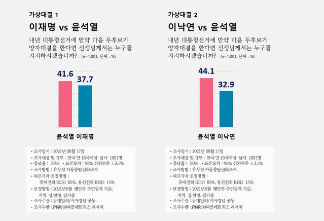 윤석열 41.6%, 이재명 37.7% '오차 내'… 윤석열 44.1%, 이낙연 32.9% '오차 밖'다자대결선 윤석열 30.9%, 이재명 28.6%, 이낙연 12.4%, 홍준표 7.1%, 최재형 5.1%뉴데일리·시사경남·PNR, 1001명 17일 조사… 이낙연 2.7%p 하락, 홍준표 2.4%p 상승
