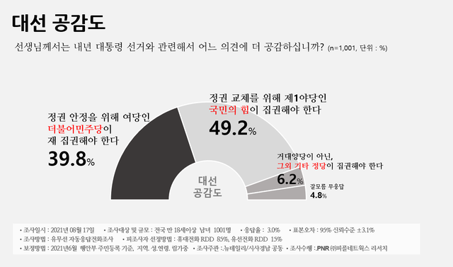 이번 여론조사에서 윤 예비후보는 이 지사와 가상 양자대결에서 지난 조사 때보다 0.8%p 떨어지면서 41.6%를 기록했다. 반면 이 지사는 지난주보다 2.3%p 오른 37.7%를 기록하면서 오차범위 내로 격차를 좁혔다.윤 예비후보와 이 전 대표의 양자대결에서는 윤 예비후보가 44.1%, 이 전 대표가 32.9%의 지지를 얻었다.'내년 대선에서 정권 유지를 위해 여당이 재집권해야 한다'는 의견은 39.8%였고, '정권교체를 위해 야당이 집권해야 한다'는 의견은 49.2%로 조사됐다.이번 조사는 유무선 자동응답 전화조사 방식으로 진행됐으며, 휴대전화 RDD(무작위 추출) 85%, 유선전화 RDD 15% 비율로 조사했다. 최종 응답률은 3.0%, 표본오차는 95% 신뢰수준에서 ±3.1%P다. 조사 완료 후 지난 6월 행정안전부 주민등록 인구를 기준으로 지역별·성별·연령별 가중값을 부여(림 가중)했다.여론조사 관련 자세한 사항은 중앙선거여론조사심의위원회 홈페이지를 참고하면 된다.