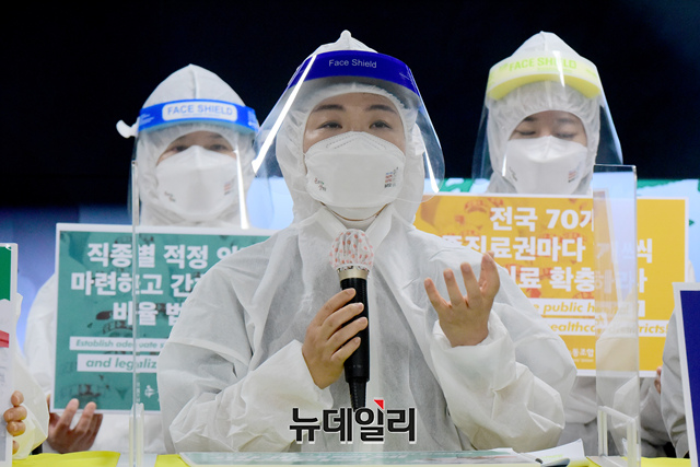 전국보건의료산업노동조합원들이 18일 오전 서울 영등포구 당산동 보건의료노조 사무실에서 기자회견을 갖고 코로나19 관련 보건의료 인력 확충과 근본대책 마련을 정부에 촉구하고 있다.