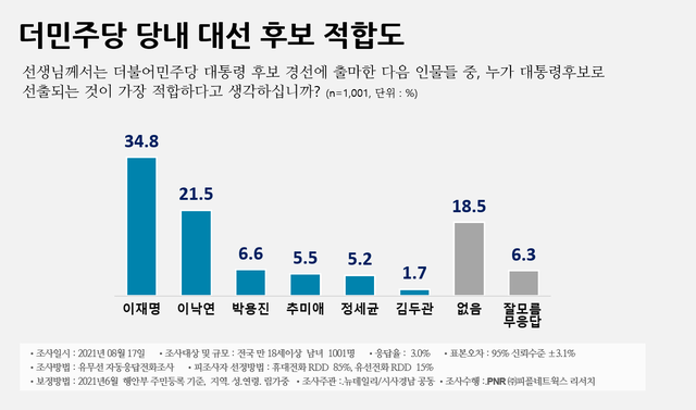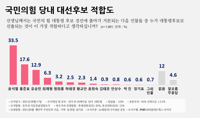 국민의힘 후보 적합도… 윤석열 33.5%, 홍준표 17.6%, 유승민 12.9%, 최재형 6.3%민주당 후보 적합도… 이재명 34.8%, 이낙연 21.5%, 박용진 6.6%, 추미애 5.5%