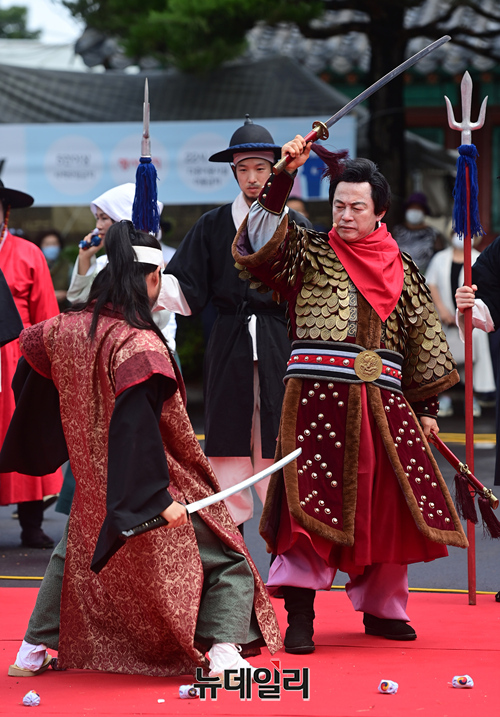 허경영 국가혁명당 명예대표가 18일 정오 경기 고양시 행주산성 정문에서 제20대 대통령 선거 출마 선언에 앞서 퍼포먼스를 하고 있다. 허 대표는 장군복장에 백마를 타고 행사장에 등장해 행주치마를 입은 백성들과 왜군을 물리치는 퍼포먼스를 재연했다.