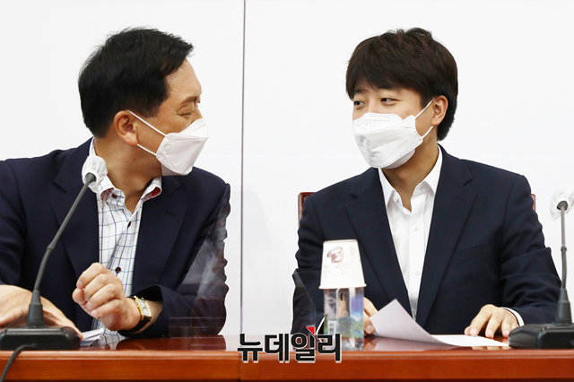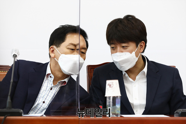 이준석 국민의힘 대표와 김기현 원내대표가 19일 오전 국회에서 열린 최고위원회의에 참석해 대화를 나누고 있다. (사진=공동취재단)