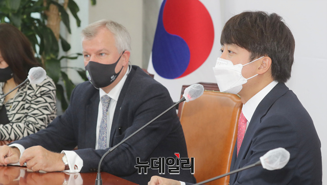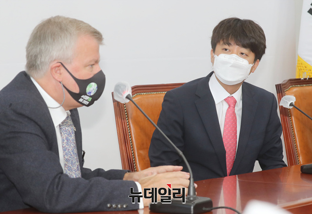 이준석 국민의힘 대표가 19일 오전 국회에서 주한 사이먼 스미스 영국대사를 접견하고 환담을 나누고 있다. (사진=공동취재단)