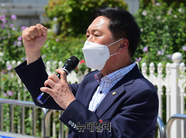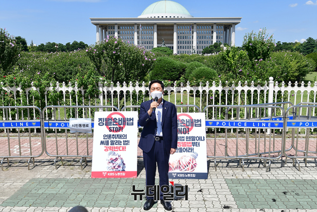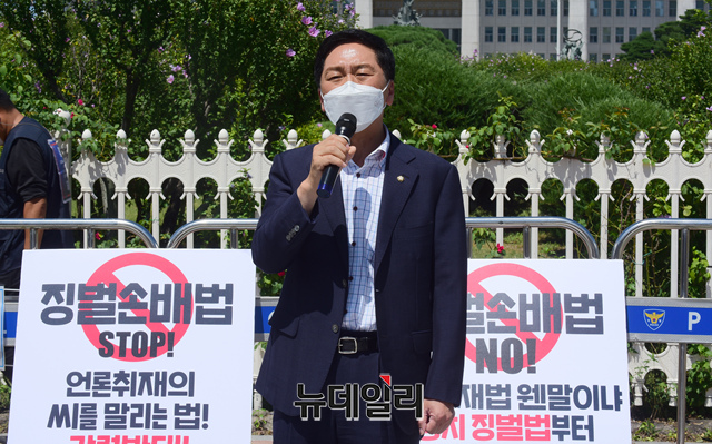 김기현 국민의힘 원내대표가 19일 오전 국회 정문 앞에서 열린 언론중재법 철폐투쟁 범국민 공동투쟁 위원회 결성식에서 언론중재법 개정안 반대 규탄사를 하고 있다.
