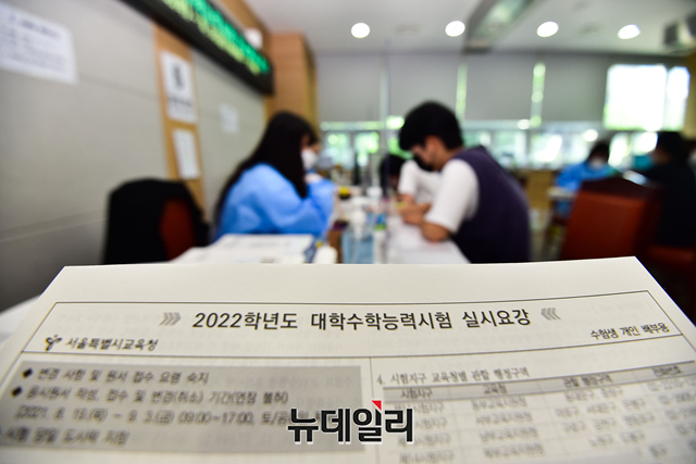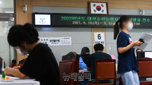 2022학년도 대학수학능력시험(수능) 응시원서 접수가 시작된 19일 오후 서울 영등포구 남부교육지원청을 찾은 수험생들이 원서를 접수하고 있다.