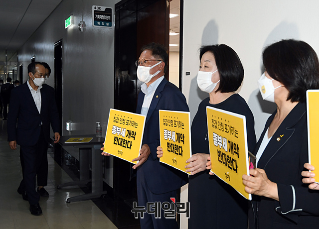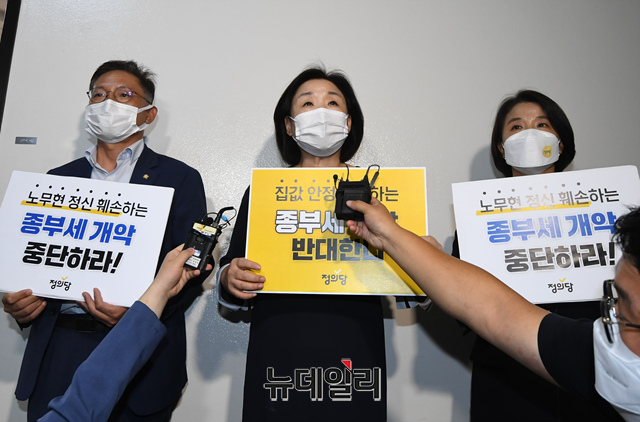 [포토] 종부세 개정안 규탄 피켓팅 하는 정의당