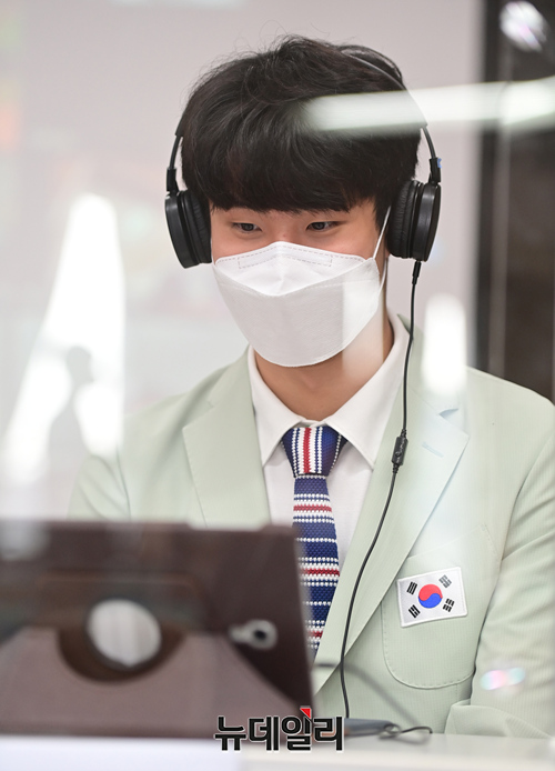 황선우(서울체고) 선수가 19일 오후 서울 종로구 서울교육청 강당에서 열린 '도쿄올림픽 국가대표 학생선수 초청 랜선 환영회'에 참석해 헤드폰을 착용하고 있다.