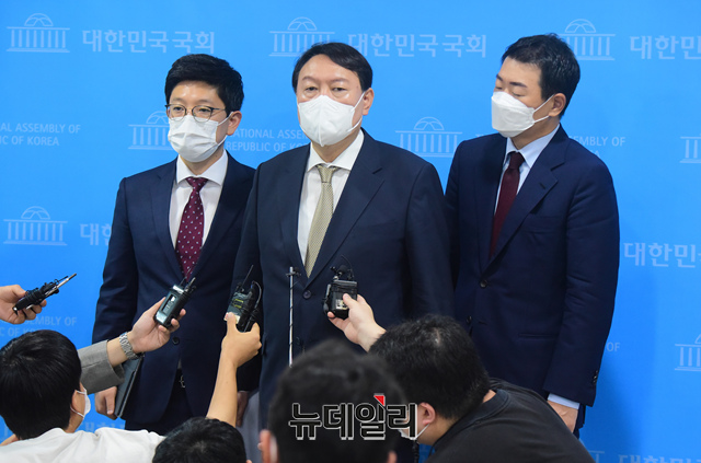 윤석열 국민의힘 대선 경선 후보가 22일 오전 국회 소통관에서 언론중재법 관련 기자회견을 마치고 기자들의 질문에 답하고 있다.