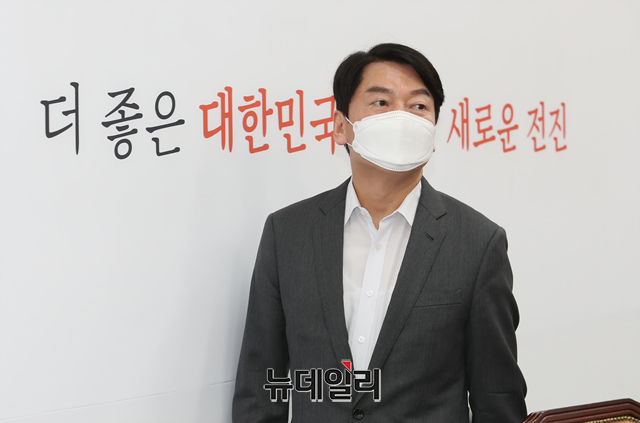 안철수 국민의당 대표가 23일 오전 국회에서 열린 최고위원회의에서 '더 좋은 대한민국을 위한 새로운 전진' 문구를 바라보고 있다. (사진=공동취재단)