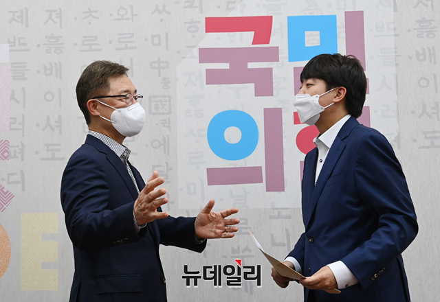 최재형 국민의힘 대선예비후보가 23일 오전 국회에서 언론악법 저지공동투쟁을 위한 '당대표-대선예비후보 연석회의' 제안서를 이준석 당대표에게 전달하고 있다. (사진=공동취재단)