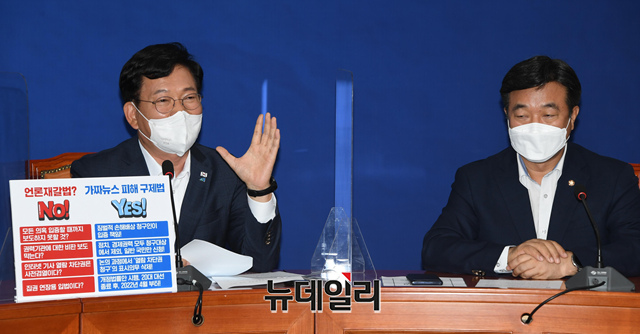 송영길 더불어민주당 대표가 23일 오전 국회에서 열린 최고위원회의에서 언론중재법 개정안 처리를 앞두고 과거 한 주간지에 게재된 오보 피해 문제점이 보도된 기사에 대한 발언하고 있다. (사진=공동취재단)
