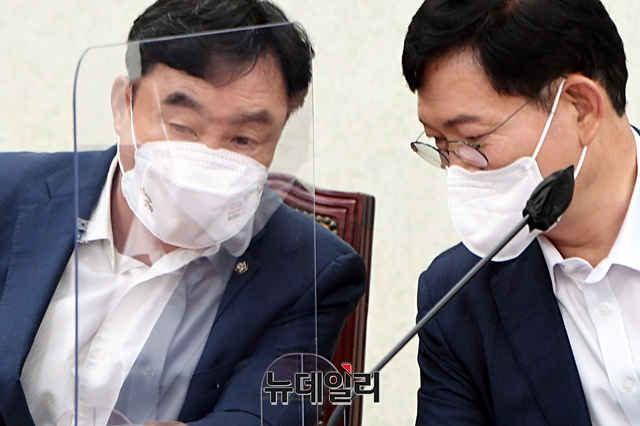 송영길 더불어민주당 대표(오른쪽)가 23일 오전 서울 여의도 국회에서 열린 보건의료노조 간담회에서 윤관석 사무총장과 대화하고 있다. (사진=공동취재단)