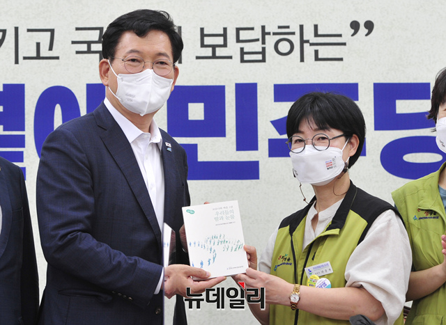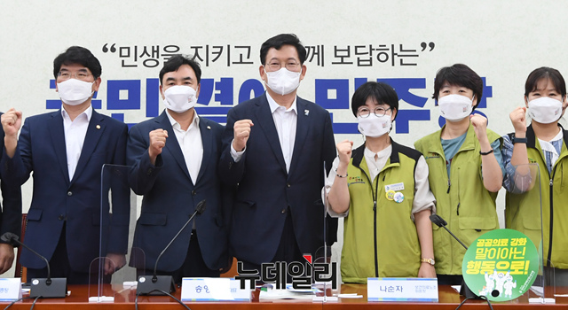 송영길 더불어민주당 대표(왼쪽 세 번째)와 나순자 전국보건의료산업노동조합위원장 등을 비롯한 참석자들이 23일 오전 서울 여의도 국회에서 열린 보건의료노조 간담회에서 기념촬영을 하고 있다. (사진=공동취재단)