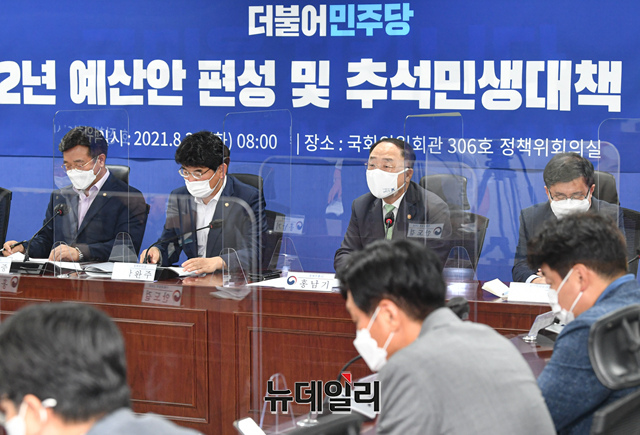 홍남기 부총리 겸 기획재정부 장관이 24일 오전 국회에서 열린 2022년 예산안 편성 및 추석민생대책 당정협의에 참석해 발언을 하고 있다. (사진=공동취재단)