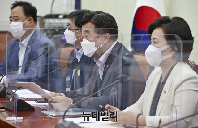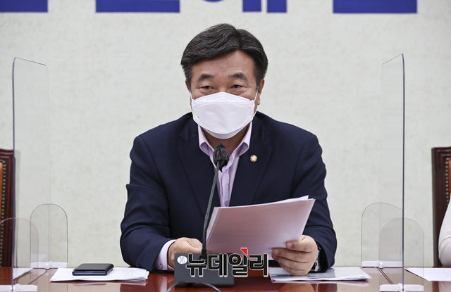 윤호중 더불어민주당 원내대표가 24일 오전 국회에서 열린 원내대책회의에서 모두발언을 하고 있다. (사진=공동취재단)