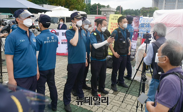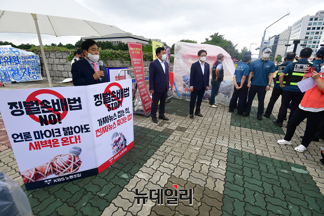 심재철 전 국회 부의장이 24일 오전 국회 앞에서 언론중재법 개정안 반대 1인 시위를 하고 있다.