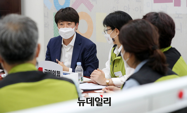 이준석 국민의힘 대표가 24일 오후 국회에서 공공의료·보건의료인력 확충 등 방역대책 전환을 위해 열린 전국보건의료산업노동조합 간담회에서 나순자 전국보건의료산업노동조합위원장을 비롯한 참석자들과 대화를 나누고 있다. (사진=공동취재단)