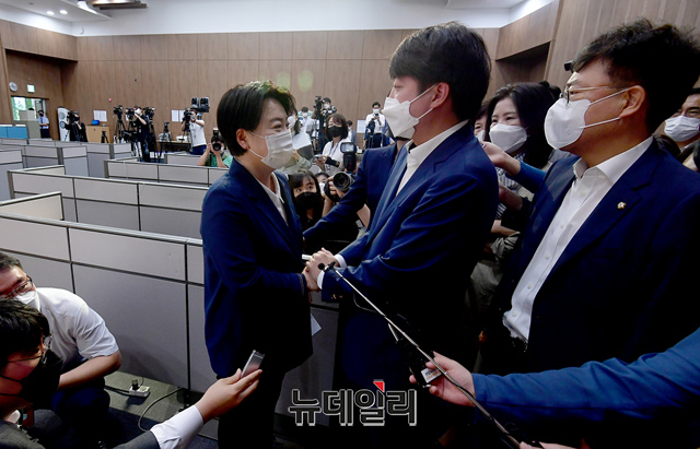 국민권익위 부동산 전수조사에서 농지법 위반 의혹이 제기된 윤희숙 국민의힘 의원이 25일 오전 국회 소통관에서 의원직 사퇴를 선언한 가운데 이준석 대표가 회견장을 찾아 윤 의원의 사퇴를 만류하고 있다.