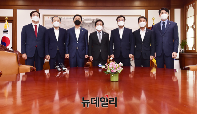 박병석 국회의장을 비롯해 윤호중 더불어민주당 원내대표, 김기현 국민의힘 원내대표가 25일 오전 국회 의장실에서 구글 갑질방지법·수술실 CCTV 설치법·언론중재법 개편안 등 본회의 일정 논의 관련 회동을 갖고 있다. (사진=공동취재단)