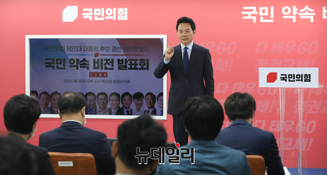 장성민 국민의힘 대선 경선 예비후보가 25일 오후 서울 여의도 중앙당사에서 열린 국민 약속 비전 발표회에서 발표를 하고 있다. (사진=공동취재단)