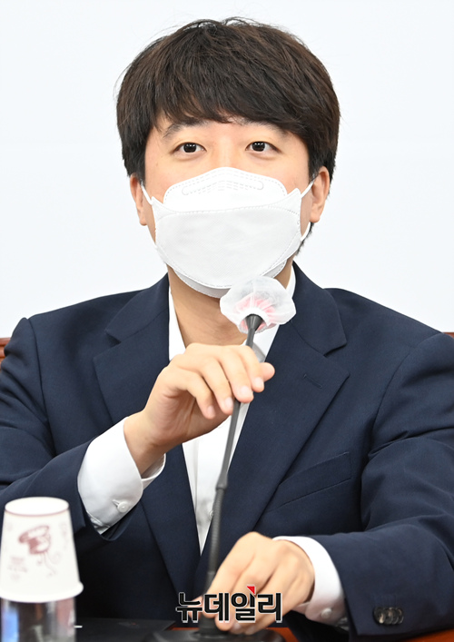 이준석 국민의힘 대표가 26일 오전 국회에서 열린 국민의힘 최고위원회의에 참석해 마스크를 고쳐쓰고 있다. (사진=공동취재단)