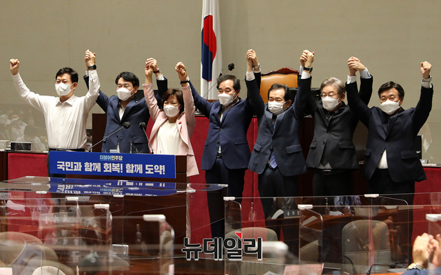 송영길 더불어민주당 대표와 대선 경선 후보들이 26일 국회에서 열린 2021년 정기국회 대비 국회의원 워크숍에서 손을 맞잡고 있다. (왼쪽부터 송 대표, 박용진 후보, 추미애 후보, 이낙연 후보, 정세균 후보, 이재명 후보, 윤호중 원내대표) (사진=공동취재단)