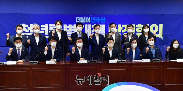 윤호중 더불어민주당 원내대표, 유은혜 사회부총리 겸 교육부 장관 등 참석자들이 26일 오전 국회 의원회관에서 열린 청년특별대책 당정협의에 참석해 기념사진을 촬영하고 있다.(사진=공동취재단)