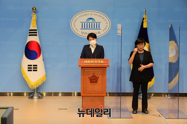 의원직과 대선 예비후보에서 사퇴를 선언한 윤희숙 국민의힘 의원이 27일 오후 국회 소통관에서 부친의 농지법 위반 의혹 관련 기자회견을 갖고 있다.