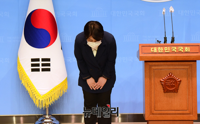 의원직과 대선 예비후보에서 사퇴를 선언한 윤희숙 국민의힘 의원이 27일 오후 국회 소통관에서 부친의 농지법 위반 의혹 관련 기자회견을 위해 입장하고 있다.