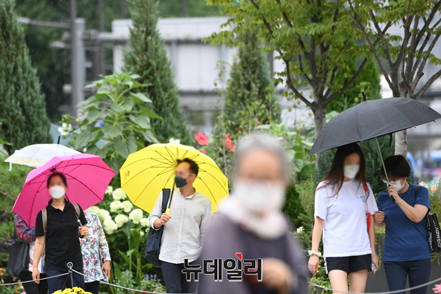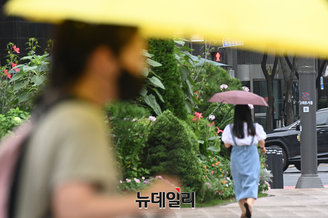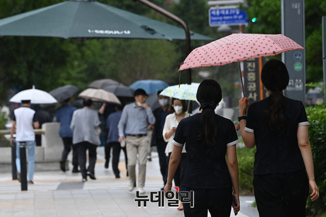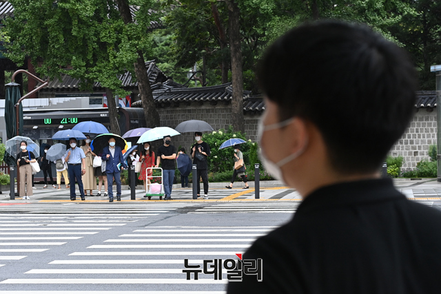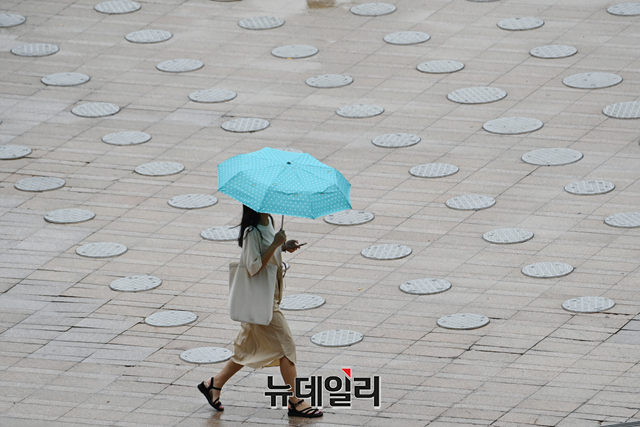 전국이 대체로 흐리고 대부분 지역에 비가 내린 27일 오후 서울 중구 시청일대에서 우산을 쓴 시민이 횡단보도를 건너고 있다.