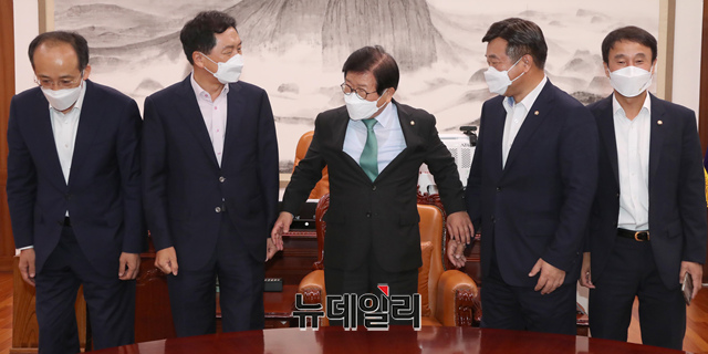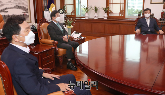 윤호중 더불어민주당 원내대표와 김기현 국민의힘 원내대표가 27일 오전 국회 의장실에서 박병석 국회의장 주재로 회동하고 있다. (사진=공동취재단)