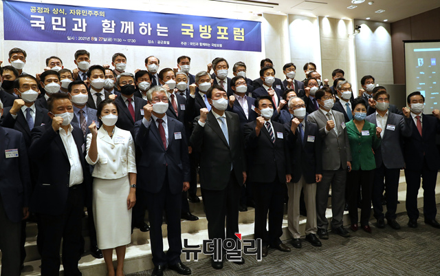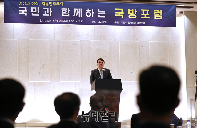 윤석열 국민의힘 대선 예비후보가 27일 오후 서울 영등포구 공군호텔에서 열린 국민과 함께하는 국방포럼 세미나에 참석해 모두발언을 하고 있다. (사진=윤석열캠프)