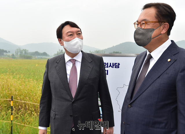 국민의힘 대권주자인 윤석열 전 검찰총장이 30일 오후 세종시 국회 세종의사당 후보지를 방문해 정진석 의원과 대화를 나누고 있다. (세종=정상윤 기자)