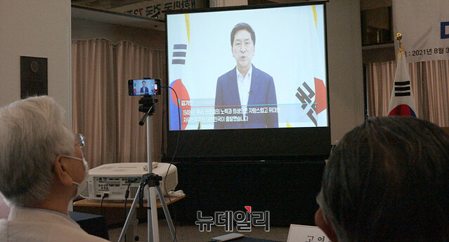 김기현 국민의힘 원내대표가 30일 오후 서울 중구 프레스센터에서 열린 '대한민국 건국 73주년 기념 학술대회'에 영상으로 축사를 하고 있다.