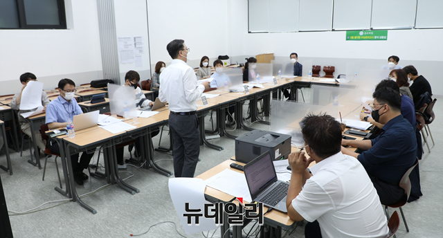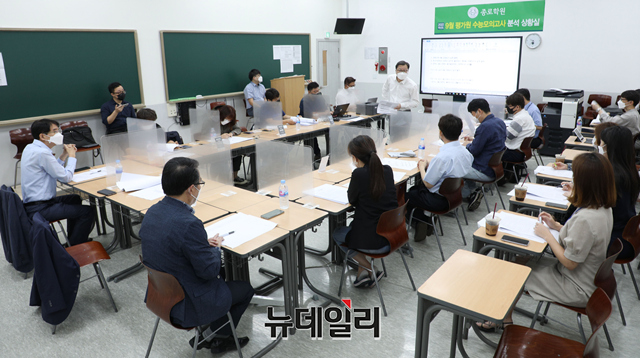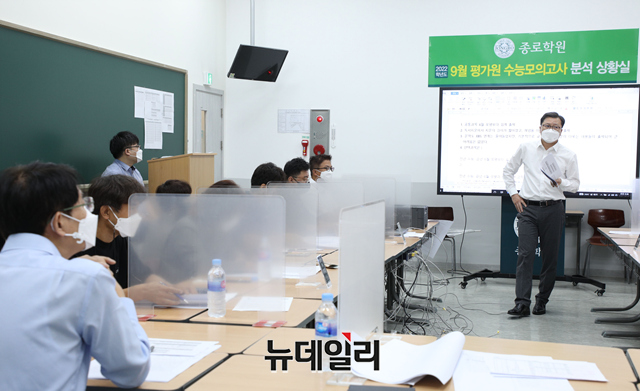한국교육과정평가원 수능모의고사가 실시된 1일 오전 서울 마포구 신촌로 종로학원 강북본원에서 강사들이 상황실에 모여 9월 모의평가의 문제성향을 분석하고 있다.