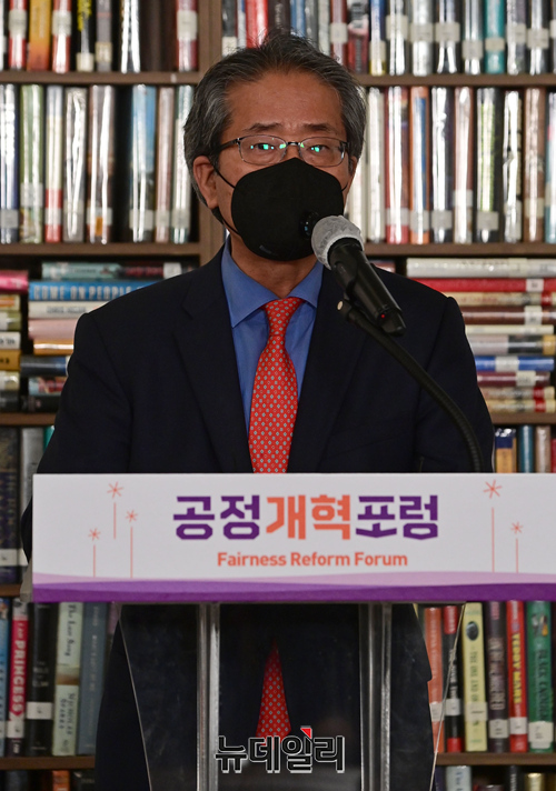 권영준 경실련 공동대표가 1일 오후 서울 종로구 인사동 복합문화공간에서 열린 공정개혁포럼 창립 토론회에서 축사를 하고 있다. 공정개혁포럼은 김영환 전 국회의원과 김형기 경북대 명예교수가 공동대표를 맡았다.