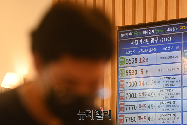 경기도 12개 광역버스 노선이 '경기도 공공버스'로 전환된 1일 오후 서울 동작구 사당역 버스정류장에서 시민들이 버스에 탑승하고 있다.