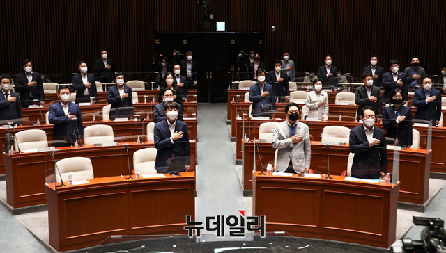 [포토] 국민의례하는 국민의힘 의원들