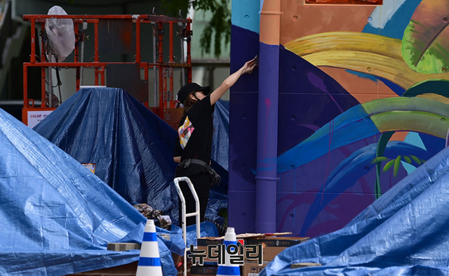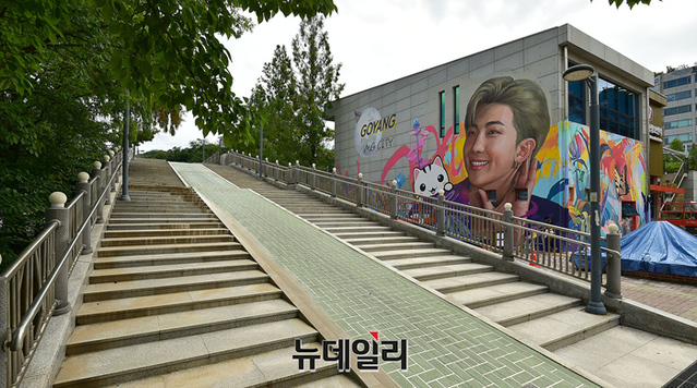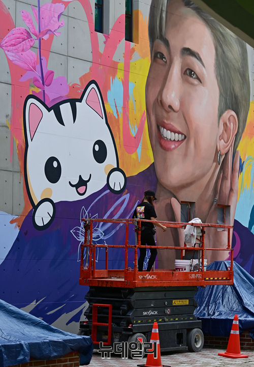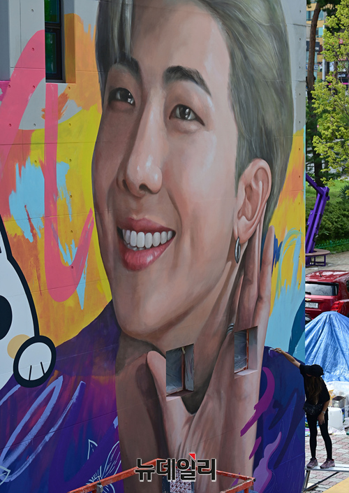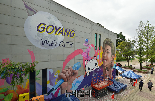 벽화 아티스트가 2일 오전 경기 고양시 고양관광정보센터 외벽에 방탄소년단(BTS) 벽화 작업을 하고 있다.이 벽화는 BTS팬클럽 아미(ARMY)와 협력해 지난달 21일부터 작업되고 있다. 가로 18m, 세로 12m 규모의 외벽에는 BTS 리더 RM(랩몬스터)가 마이크를 잡고 웃고 있는 모습과 고양시 캐릭터가 RM의 어깨 위에 올라와 있는 모습이다.벽화는 현재 약 90% 완성됐다. 고양시는 관광객들이 벽화와 함께 사진을 찍을수 있는 포토존 공사를 진행중이다. (경기 고양=정상윤 기자)