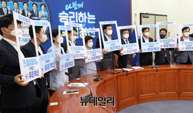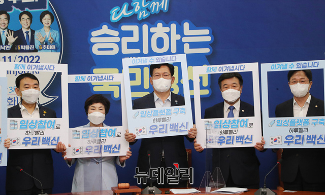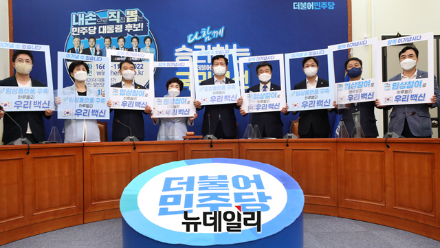 송영길 더불어민주당 대표, 윤호중 원내대표 및 최고위원들이 3일 국회에서 열린 최고위원회의에 앞서 코로나19 백신 국민 임상시험 참여를 독려하는 퍼포먼스를 하고 있다.