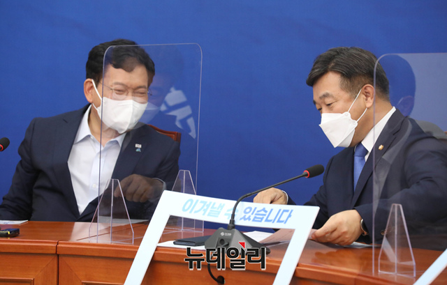 송영길 더불어민주당 대표와 윤호중 원내대표가 3일 오전 국회에서 열린 최고위원회의에서 대화를 나누고 있다. (사진=공동취재단)