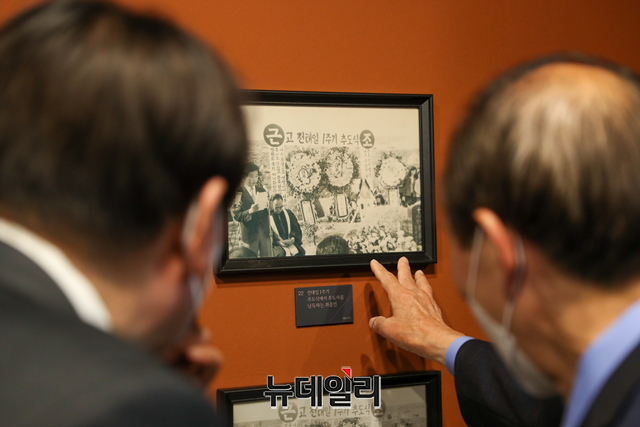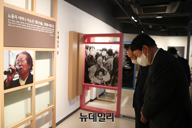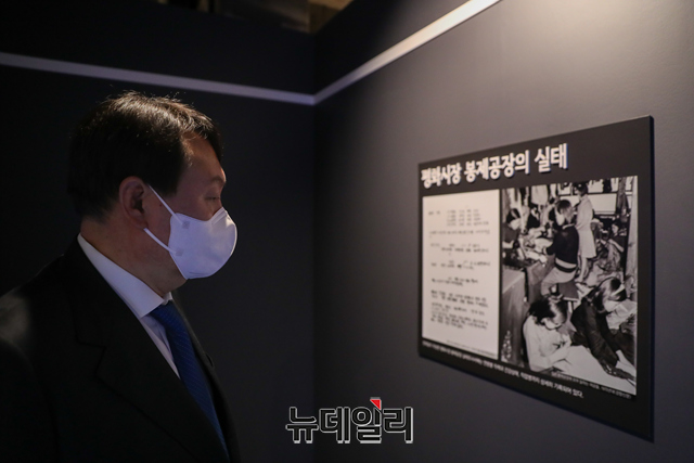 윤석열 국민의힘 대선주자 예비후보가 3일 오후 서울 종로구 전태일 기념관을 방문해 故 이소선여사 10주기 전시회를 살펴보고 있다. (사진=윤석열캠프)