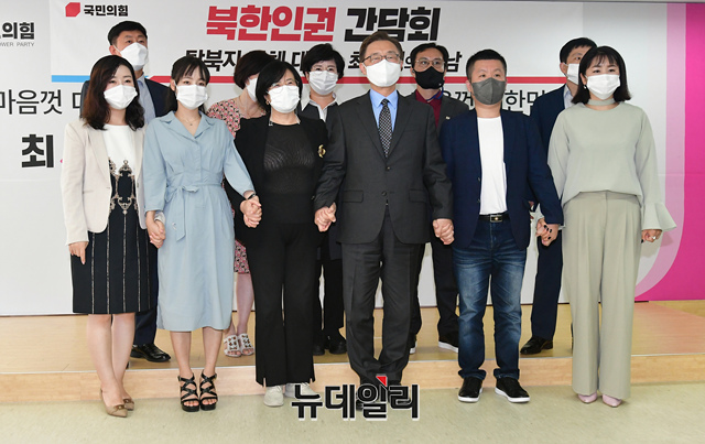 최재형 국민의힘 대선 경선 예비후보가 3일 서울 여의도 선거캠프에서 열린 탈북자 단체 대표·북한인권 간담회에 참석해 기념사진을 촬영하고 있다.