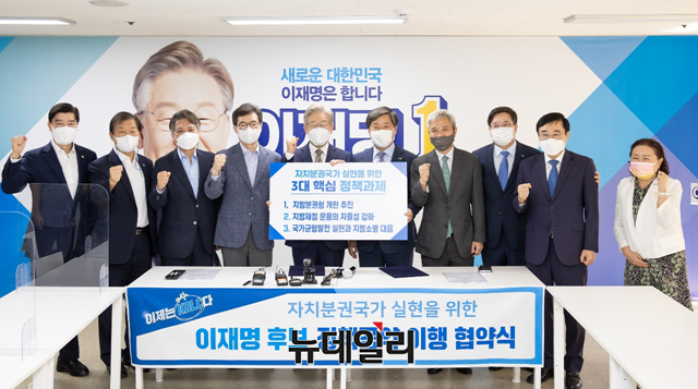이재명 더불어민주당 경선 후보가 3일 서울 여의도 선거캠프에서 열린 전국자치분권민주지도자회(이하 KDLC)의 상임대표 염태영 수원시장과 KDLC가 선정한 자치분권국가 실현을 위한 '10대 정책공약' 이행을 약속하는 협약을 체결하고 있다. (사진=이재명캠프)