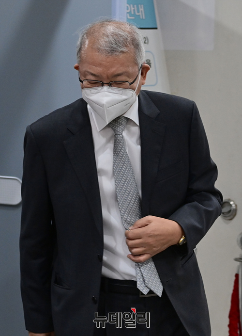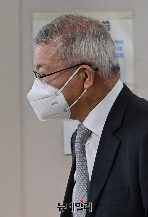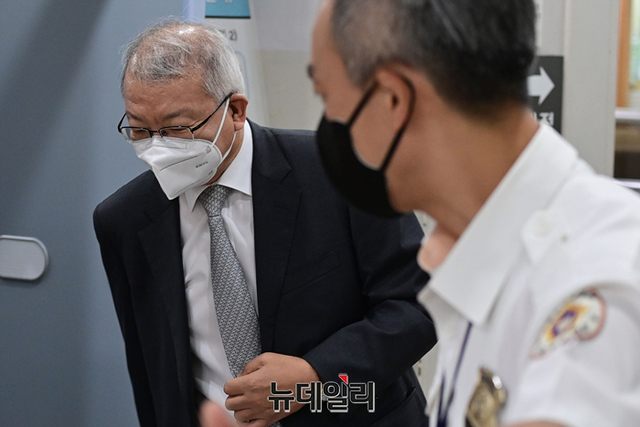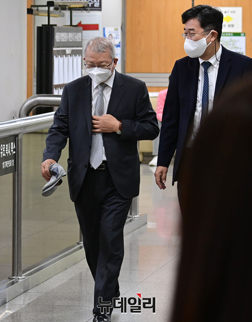 양승태 전 대법원장이 6일 오전 서울 서초구 서울중앙지법에서 열린 사법행정권 남용 공판에 출석하고 있다.
